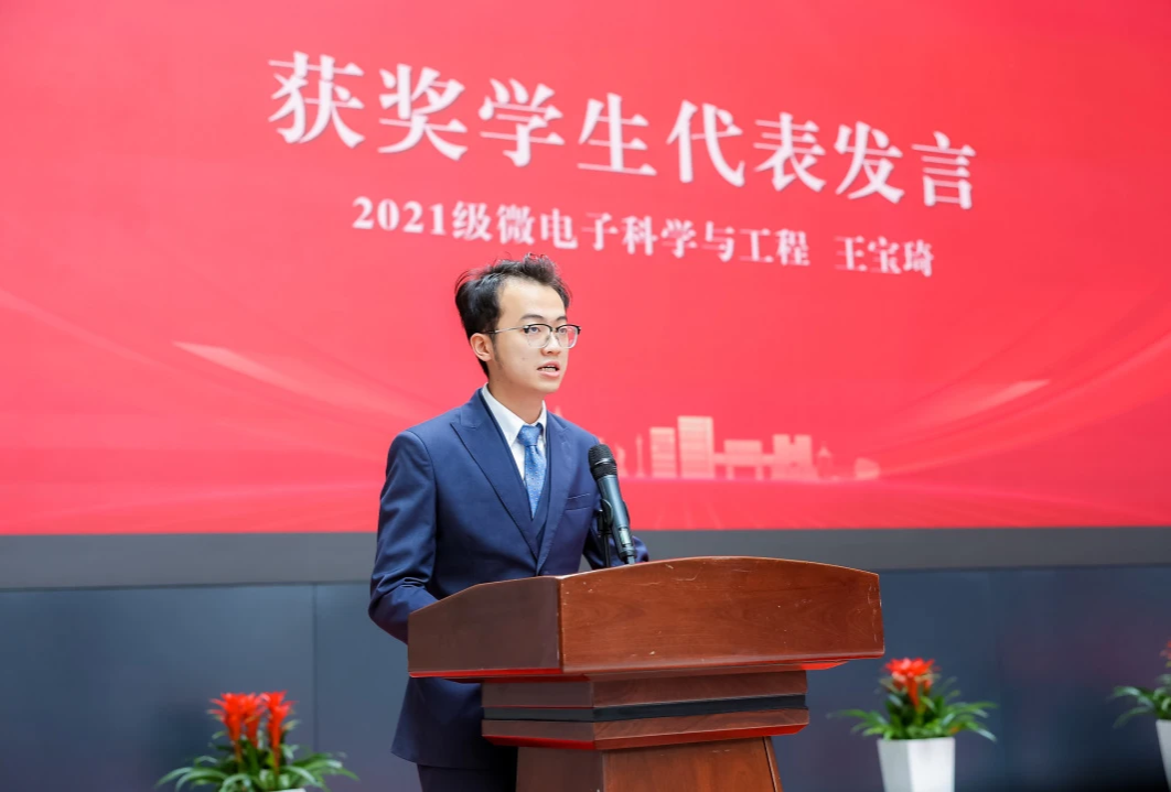 获奖员工代表2021级微电子科学与工程专业本科生王宝琦发言。他首先代表所有获奖同学向吴启迪教授、乔非教授、各位员工和老师致以崇高的敬意和由衷的感谢。他表示,启迪奖学金不仅引领青年学子在专业领域不断探索和创新,激发追求卓越、勇于挑战的精神,更能激励大家在未来的学习和工作中以更大的热情和决心投身于实践。生逢中华民族发展最好时期的青年学子,当以“制出将来之少年中国”为己任,以真才实学攻克“卡脖子”技术难关,积极弘扬启迪奖学金的精神,担时代之责,承报国之行,与学校同呼吸、共进步。