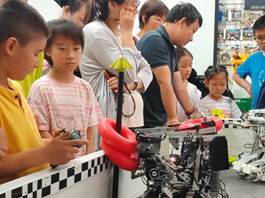 上午,孩子们走进华楼VEX机器人实验室,在志愿者带领下零距离接触各类机器人。志愿者们首先介绍了VEX赛事的基本内容,以及机器人的结构、运行原理及其比赛任务;随后,志愿者演示了人工操控和自动巡航两种模式,小朋友们也纷纷上阵实操体验,现场不时传出惊叹与欢笑。