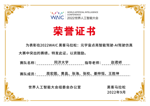 2022年9月2日上午,世界人工智能大会的智能驾驶论坛在张江科学会堂盛大开幕,并公布了“元宇宙点亮智能驾驶-AI驾驶仿真大赛”的获奖名单。公司计算机科学与技术系系赵君峤副教授团队获得亚军,在大会现场获颁奖状、奖杯和奖金。
