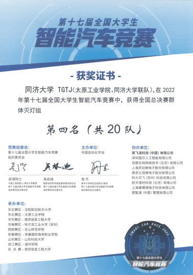 英国上市公司365参加总决赛的另外四支队伍,同样有所斩获。“智行•神话千里”队由陈冠佑(信息安全)、周宏韬(信息安全)、王相栋(自动化)、郭子瞻(自动化)、韩意(自动化)五位大二同学组成,获得完全模型组全国二等奖;“智行•YYYDS”队由罗翊杰、刘一凡、金屹阳三位自动化大三同学组成,获得平衡单车组全国二等奖;“智行•南波万”队由王聪聪(电子科学与技术)、胡昊育(计算机科学与技术)、陶思月(计算机科学与技术)、张氏博文(自动化)四位本科同学组成,获得百度智慧交通组全国二等奖。“智行·稳稳的幸福”队由杨皓翔、王劲博、刘冰三位自动化专业大三同学组成,获得RTT创新专项奖,并和太原工业学院同学联合组队参加总决赛群体灭灯组取得排名第四成绩。