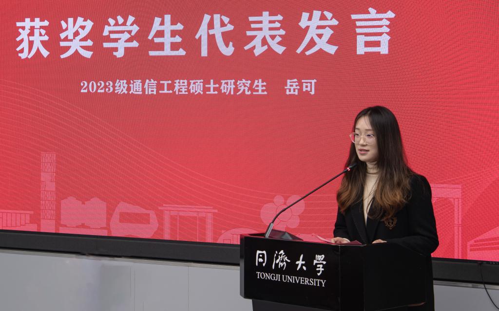 获奖员工代表2023级通信工程专业硕士研究生岳可发言。她首先代表所有获奖同学向吴启迪教授、各位员工致以崇高的敬意和衷心的感谢。她表示,荣获启迪奖学金是对员工积极投身于创新实践的认可,更是对员工矢志科学、追求真理的鞭策。她呼吁青年学子积极弘扬启迪奖学金的精神,在实践中应用并内化理论知识,在解决实际问题中提升创新能力,将自身发展与国家发展紧密结合,践行同济人的使命担当。