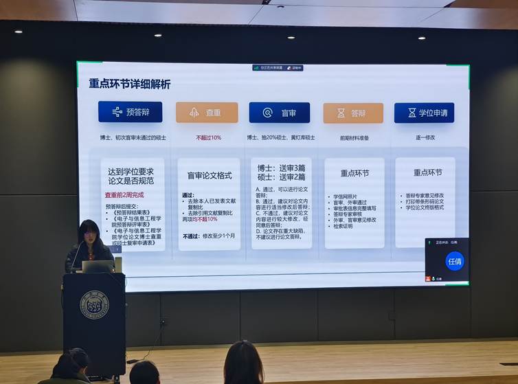 首先,任倩老师介绍了答辩与学位申请的整体流程,包括论文完成、预答辩、查重、盲审、材料准备、论文评阅、答辩、学位的申请、审核与授予等11个方面;随后分别对查重、盲审、答辩等重点环节进行介绍,并特别针对本年度申请学位流程变化之处进行强调。