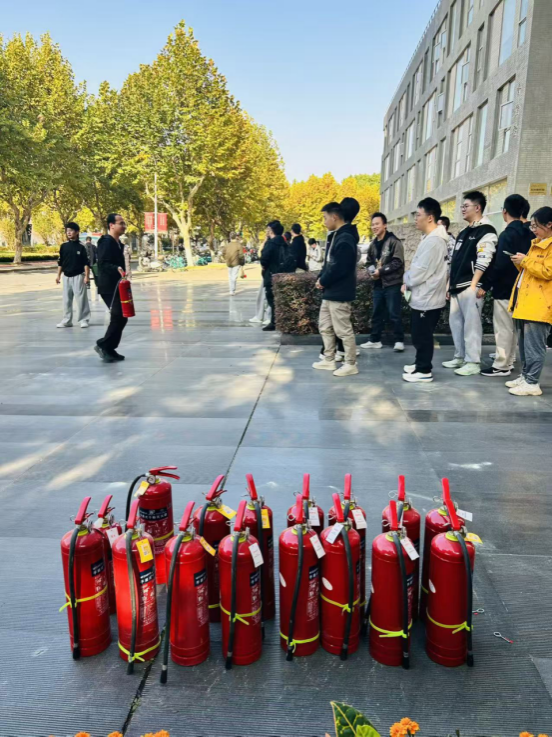 理论培训结束后,全体参训人员前往户外演练场地,在保卫处专家彭亮老师的指导下,进行灭火器实操演练。彭老师重点讲解了“提拔握压”的操作要领,确保每个人都能正确使用消防器材。