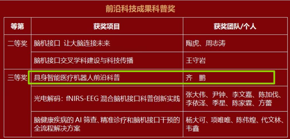 12月20日,2025年上海科普教育创新奖颁奖典礼举行,公司医疗机器人实验室负责人齐鹏副教授申报的“具身智能医疗机器人前沿科普”项目,成功荣获首次设立的“前沿科技成果科普奖”个人三等奖,这标志着公司在智能医疗领域科研与科普深度融合的实践获得专业认可。