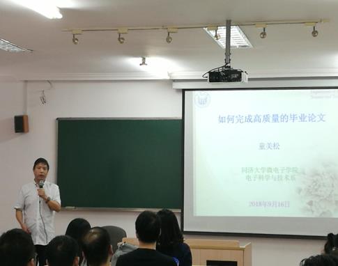 典礼后,童美松教授为大家做讲座,分别对科学技术发展的一般规律、如何开展高质量科研活动、如何完成高质量的毕业论文进行了深入的阐述,并提醒大家要重视学术规范,建立知识产权意识,为大家的前行指引了方向,讲座在雷鸣般的掌声中结束。