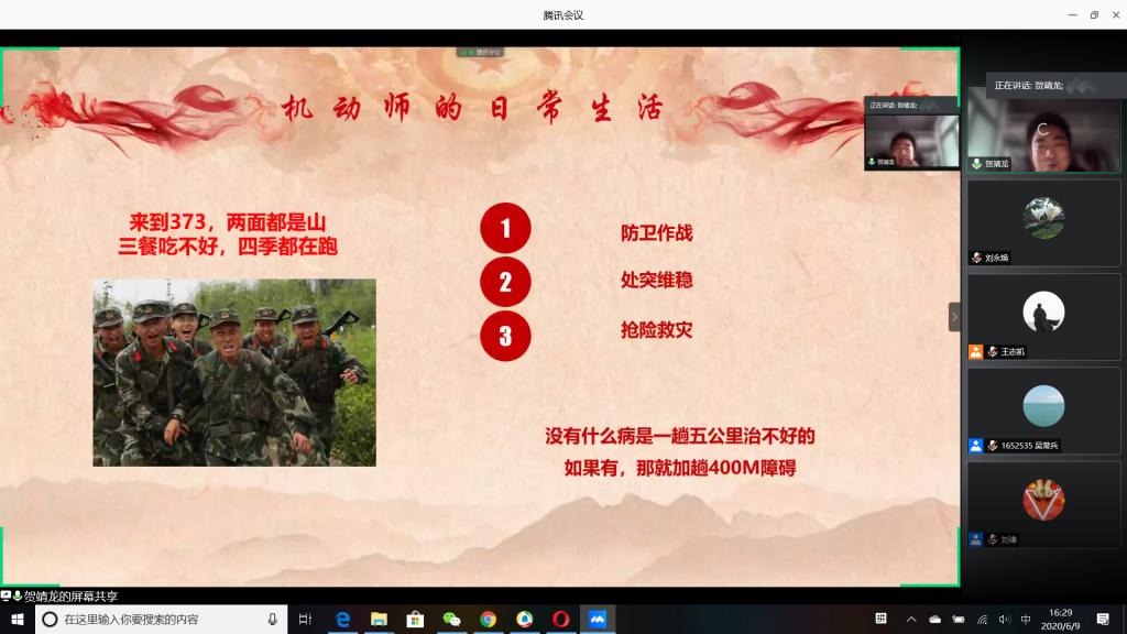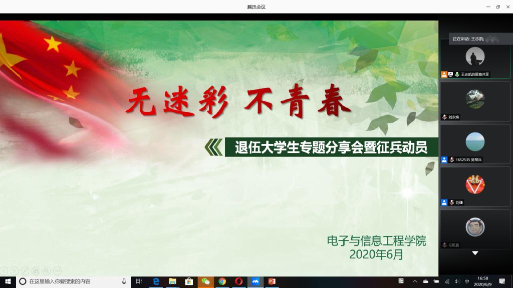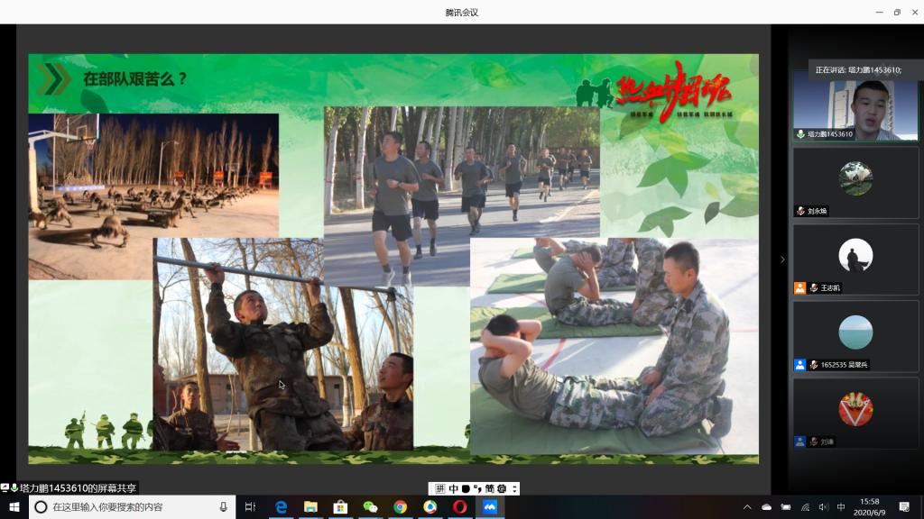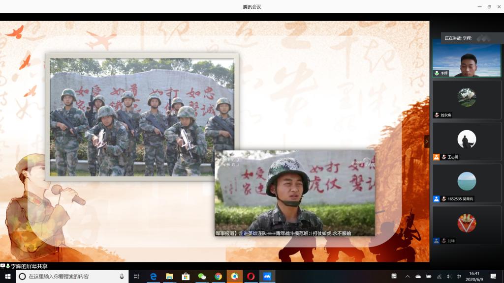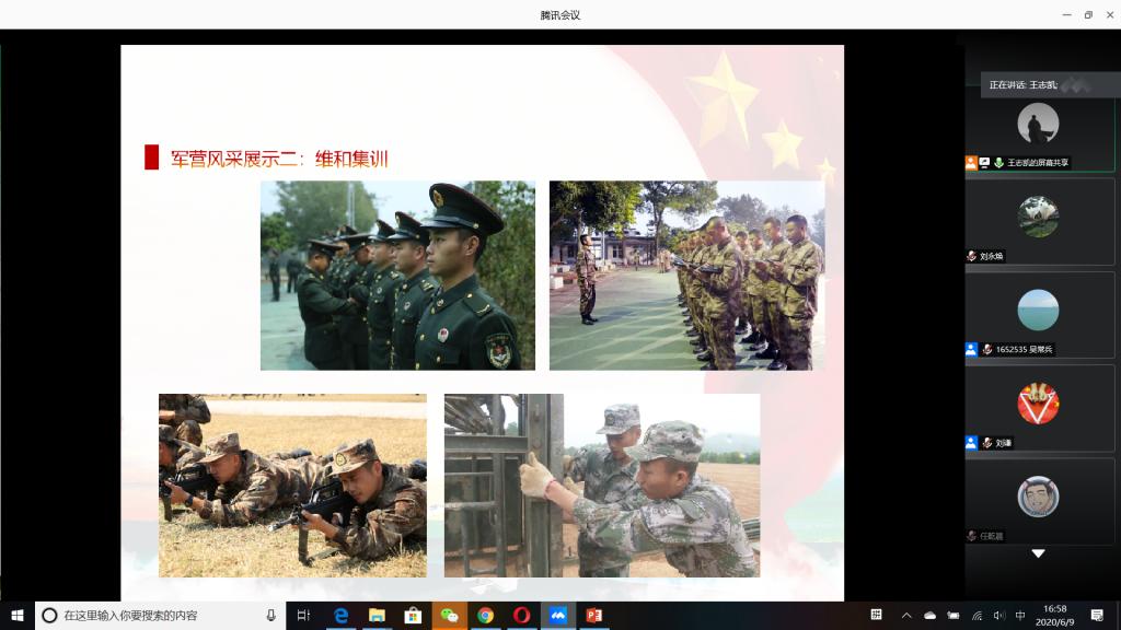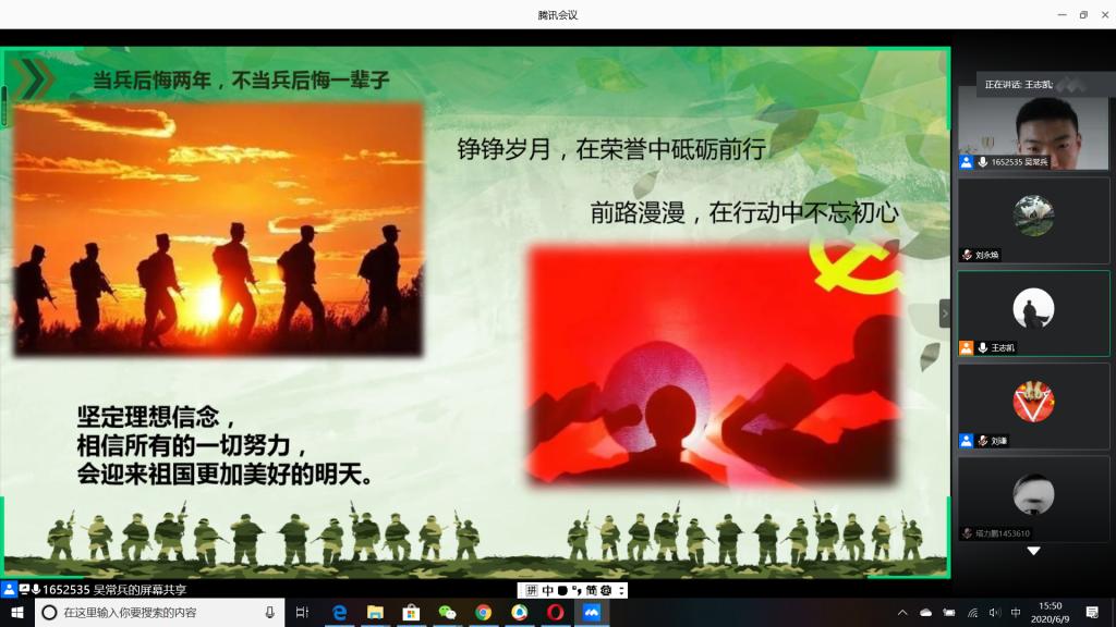 “国无防不立,民无兵不安”,巩固国防和强大军队是新时代坚持和发展中国特色社会主义、实现中华民族伟大复兴的战略支撑。6月9日下午,公司成功举办以“无迷彩,不青春”为主题的线上退伍老员工分享暨2020年征兵动员会,会议由公司退伍老员工王志凯主持,员工党总支副书记刘永焕、学工办主任刘谦、辅导员汤若琦、王秋晨和常恒以及有意向应征入伍的老员工参加了分享动员会。分享会上,来自四个学院的八名优秀退伍老员工从国防的意义及我国部队的发展与改革展开,结合自己的亲身经历,向参会的老员工分享了自己难忘的军旅生涯和参军故事,号召更多的有志青年,以强烈的政治意识和使命担当,携笔从戎,以实际行动积极支持和服务改革强军战略。