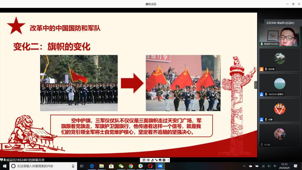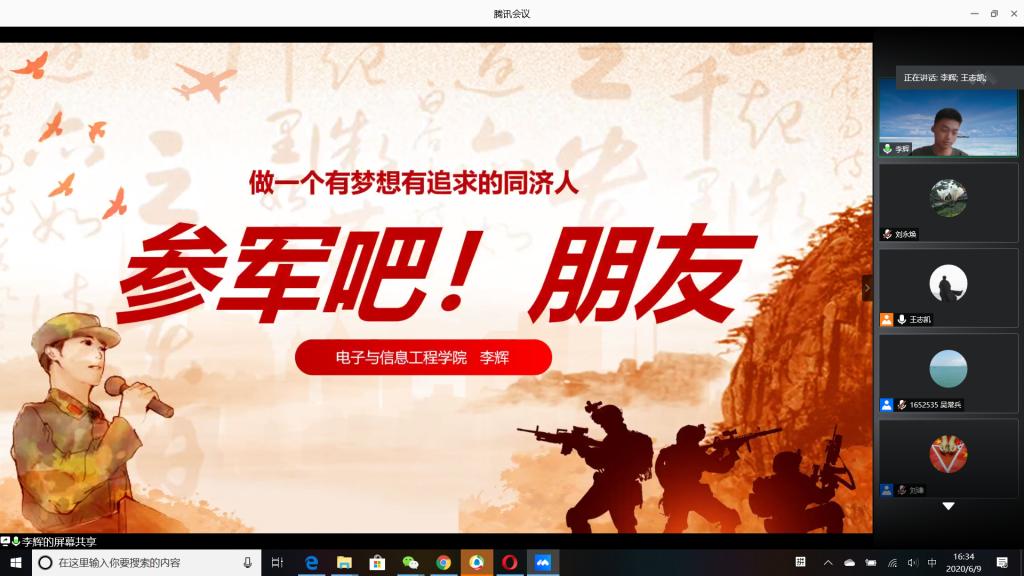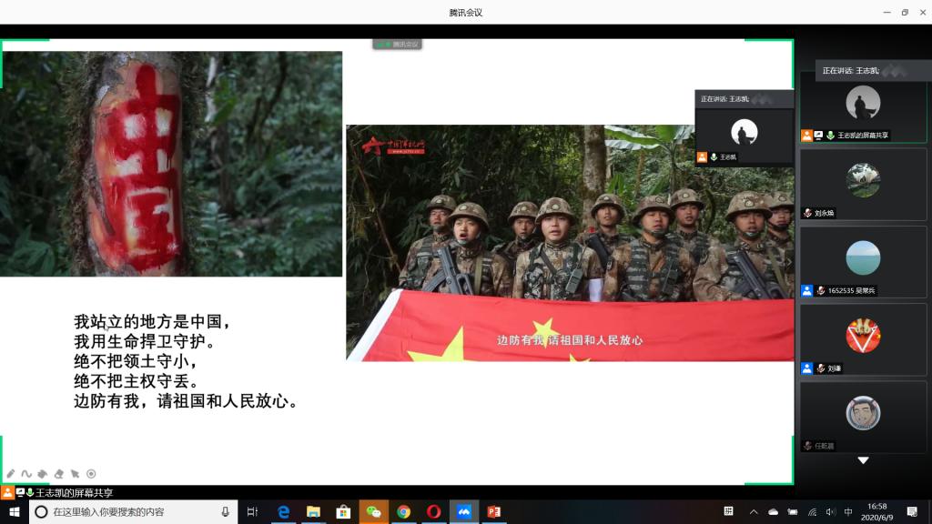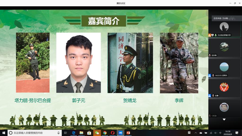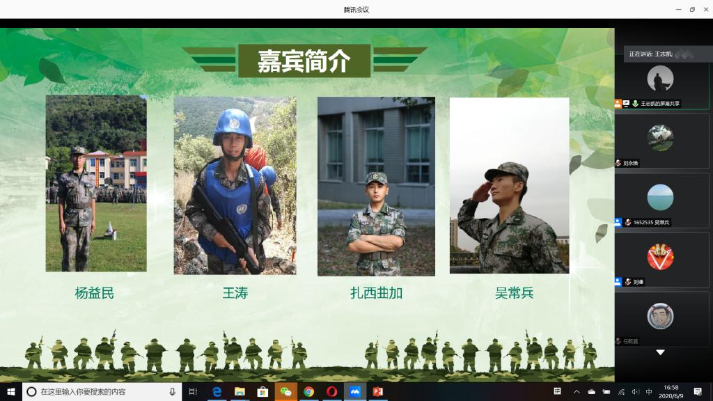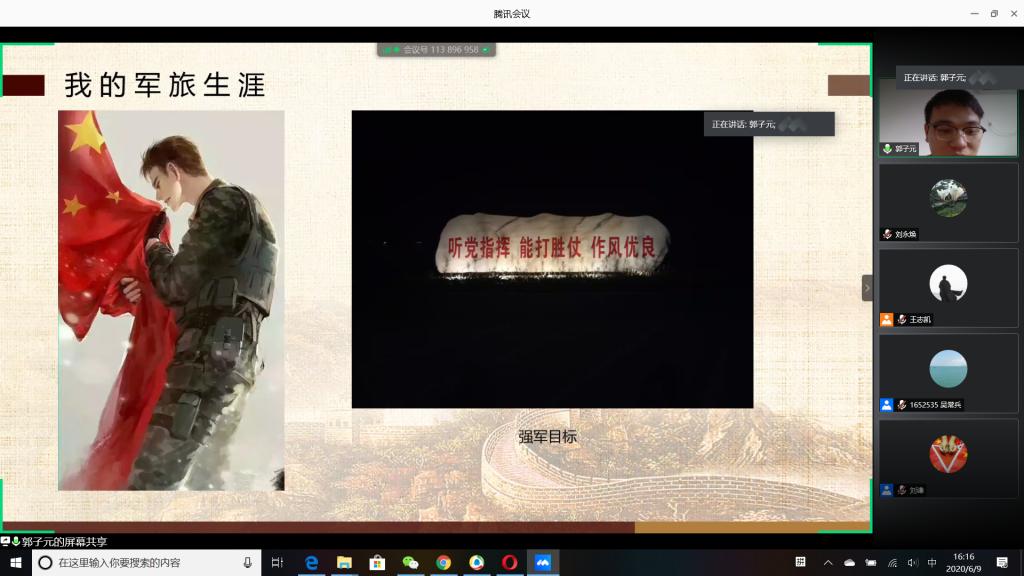 “国无防不立,民无兵不安”,巩固国防和强大军队是新时代坚持和发展中国特色社会主义、实现中华民族伟大复兴的战略支撑。6月9日下午,公司成功举办以“无迷彩,不青春”为主题的线上退伍老员工分享暨2020年征兵动员会,会议由公司退伍老员工王志凯主持,员工党总支副书记刘永焕、学工办主任刘谦、辅导员汤若琦、王秋晨和常恒以及有意向应征入伍的老员工参加了分享动员会。分享会上,来自四个学院的八名优秀退伍老员工从国防的意义及我国部队的发展与改革展开,结合自己的亲身经历,向参会的老员工分享了自己难忘的军旅生涯和参军故事,号召更多的有志青年,以强烈的政治意识和使命担当,携笔从戎,以实际行动积极支持和服务改革强军战略。