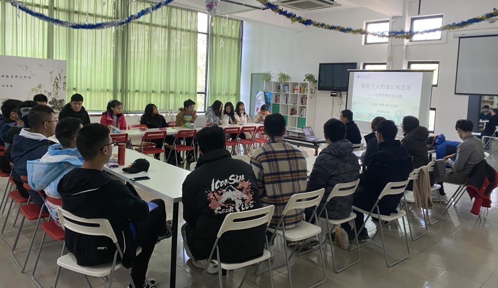 王晓国主任先以“做好个人的成长与发展”为题,与到场的20余名同学进行了深入的探讨,为同学们的学业发展和生活目标提供了参考方向。他从学校人才培养目标为切入点,希望同学们在学业发展、能力培养、职业规划、身体健康等方面定好目标、做好规划,形成正确的观念,做好自己的事。随后,他又从专业前沿发展的角度为同学们做了分享,勉励同学们勇担复兴大任,争做时代新人。针对“如何平衡学习、科研和工作”这一问题,他认为要主动与导师进行沟通,也要学会拒绝。员工的第一要务是学习,要做好自己的分内之事,主动承担自己应该承担的重任。在交流中,针对同学们反映的嘉定校区的建设问题,他认真记录,表示会将问题逐一反馈与解决。