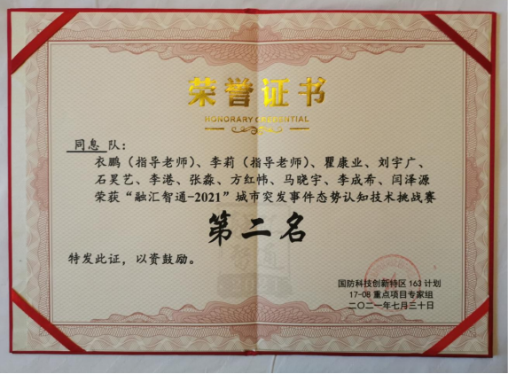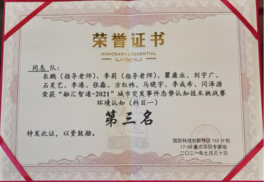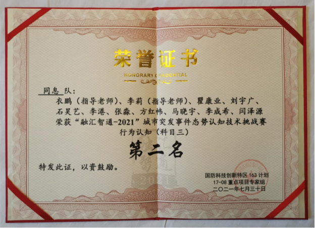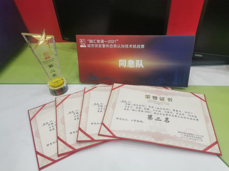 2021年7月30日,在重庆理工大学举办的“融汇智通—2021”城市突发事件态势认识技术挑战赛中,由公司师生组成的“同息队”在所有比赛的三个科目中获得两项第二名、一项第三名,最终获得总成绩第二名的佳绩。
