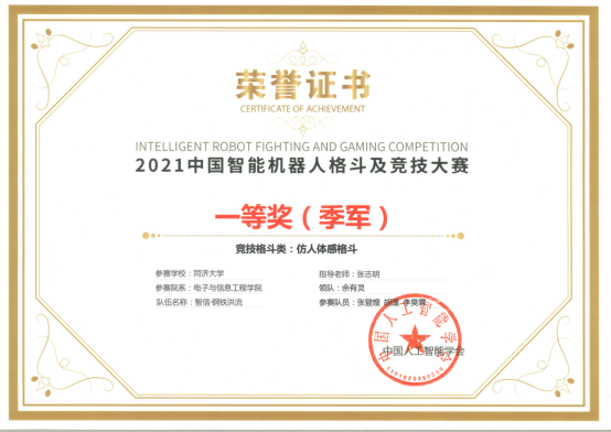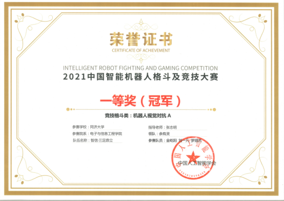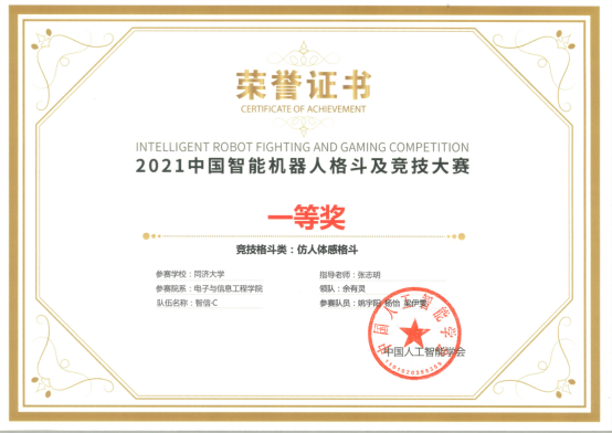 由中国人工智能学会主办的中国智能机器人格斗及竞技大赛决赛设置3大类近10个项目,吸引来自全国200余所高校的近600余支队伍参与,推动AI、机器人技术在广大青年中的快速普及和发展。由控制科学与工程系教师张志明和余有灵指导,经过激烈的角逐,在“仿人体感格斗”和“机器人视觉对抗”两个项目下各有来自人工智能+机器人竞赛实验室的两支队伍进入决赛。四只队伍在决赛中表现出色,其中:“机器人视觉对抗”赛项中,金屹阳(大三,自动化)、刘一凡(大三,自动化)、罗翊杰(大三,自动化)组成的“智信•三足鼎立”队获得一等奖(冠军),俞书彬(大二,机械设计制造及其自动化/机械学院)、张雨(大二,电子信息工程)、张梓瀚(大二,软件工程/软件学院)、朱睿潇(大二,数学与应用数学/数学学院)组成的“智信•A-Team”队获得一等奖;“仿人体感格斗”赛项中,张登煌(大三,自动化)、胡蓬(大三,自动化)、李昊霖(大三,自动化)组成的“智信•钢铁洪流”队获得一等奖(季军),姚宇阳(大三,通信工程)、杨怡(大三,自动化)、梁伊雯(大三,软件工程)组成的“智信•C”队获得一等奖。