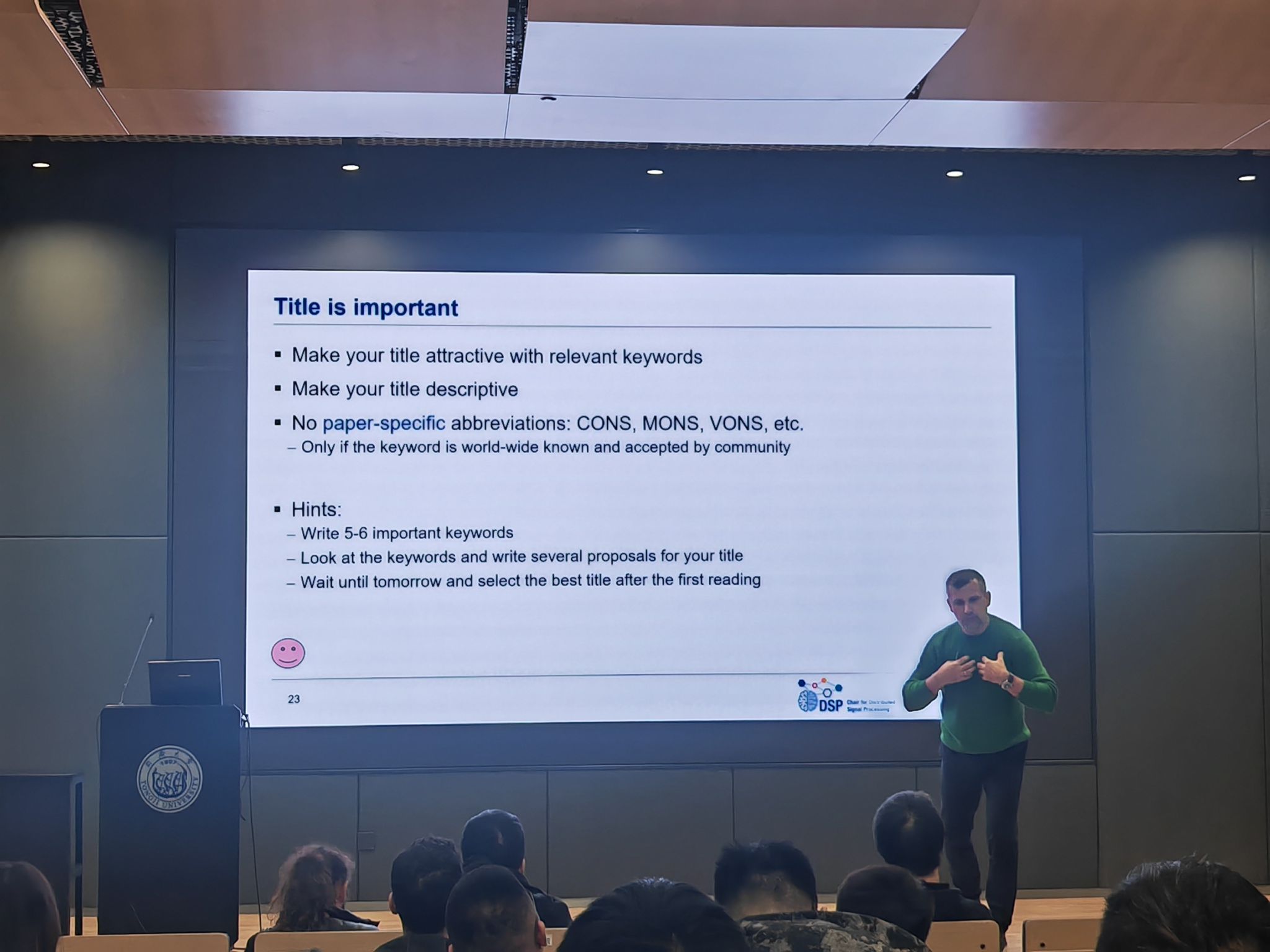 首先,Haris Gacanin教授点明本次报告的核心受众为青年科研工作者与在读研究生,强调报告将以实操性指南为核心,结合科研实践案例拆解学术论文写作的全流程。他开篇便指出,学术论文的核心目标是清晰且有说服力地传递全新科研知识,而实现这一目标的前提,是在动笔前充分厘清目标期刊定位、目标受众需求以及学术领域的普遍写作规范,只有锚定了写作方向,才能避免论文与期刊调性不符、核心价值无法凸显的问题。同时,他补充道,规整的论文结构本质上是严谨科研流程的外在体现,因此从研究初期就需做好问题界定与成果贡献的明确梳理。接着,Haris Gacanin教授将重点聚焦于论文各模块的写作技巧。针对摘要撰写,他提出要做到“信息完整且凝练”,需同时涵盖研究背景、核心方法、关键成果与应用价值;在引言部分,他强调要搭建清晰的逻辑链条,从领域痛点切入,逐步过渡到自身研究的必要性与创新性;对于技术内容的呈现,他建议兼顾专业性与可读性,通过分层阐述降低理解门槛,同时善用图表、实例辅助论证,让抽象的技术原理更易被感知。此外,他还梳理了论文写作中的常见误区,如表述模糊、逻辑冗余、研究意义阐述不足、缺乏科学论证等,并用反面案例直观展示了这些问题对论文质量的影响,让在场师生清晰认识到语言与结构优化对提升论文影响力的重要性。