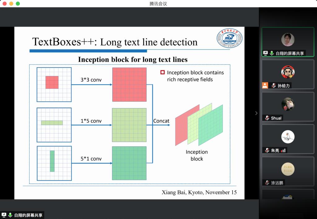 白翔教授的报告题目为“场景文本检测与识别”,并针对不规则文本检测做了详细介绍和分析。在本次报告中,白翔教授照例介绍了文本检测的发展历史、研究意义和主要思路。在后面的详细介绍部分,针对多个解决思路,从检测和识别的两个部分,详细介绍了多篇论文中的方法。在不规则文本检测部分,针对密集文本、弯曲文本等问题进行了讲解。虽然报告在线上举行,但是仍旧取得了良好效果,诸多该领域的最新进展使同学们感到新颖、有趣,并加深和拓展师生的理论理解和学术视野。报告后听众与专家进行了热烈的讨论。