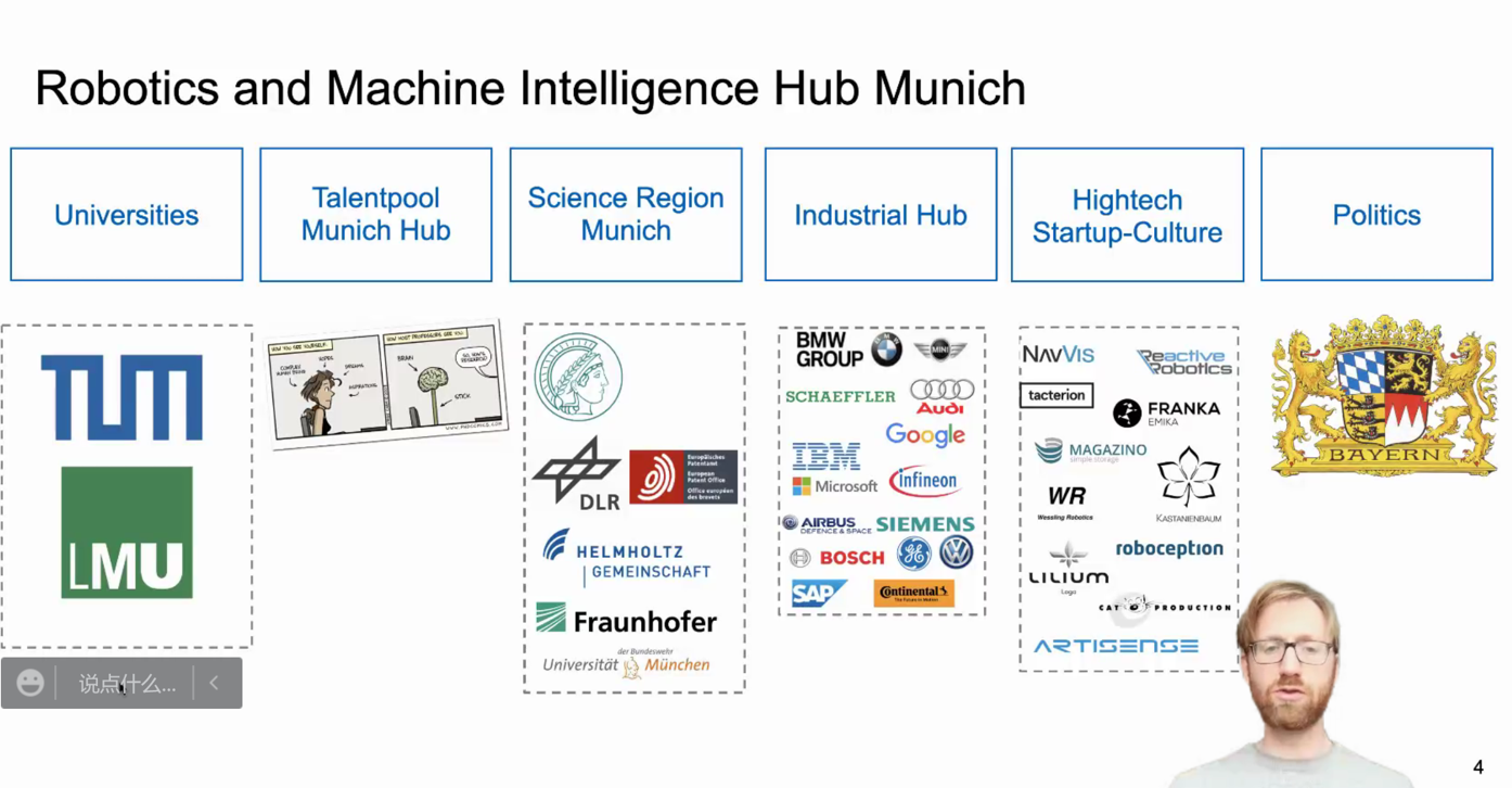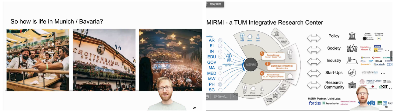 Jan Harder博士即将入职公司担任中德智能科学与技术研究中心德方副主任。他在报告中介绍了德国科研资助的等级、政府关注内容、慕尼黑工业大学在机器人与人工智能方向上的实验室、研究方向、未来发展、校园文化及巴伐利亚文化。