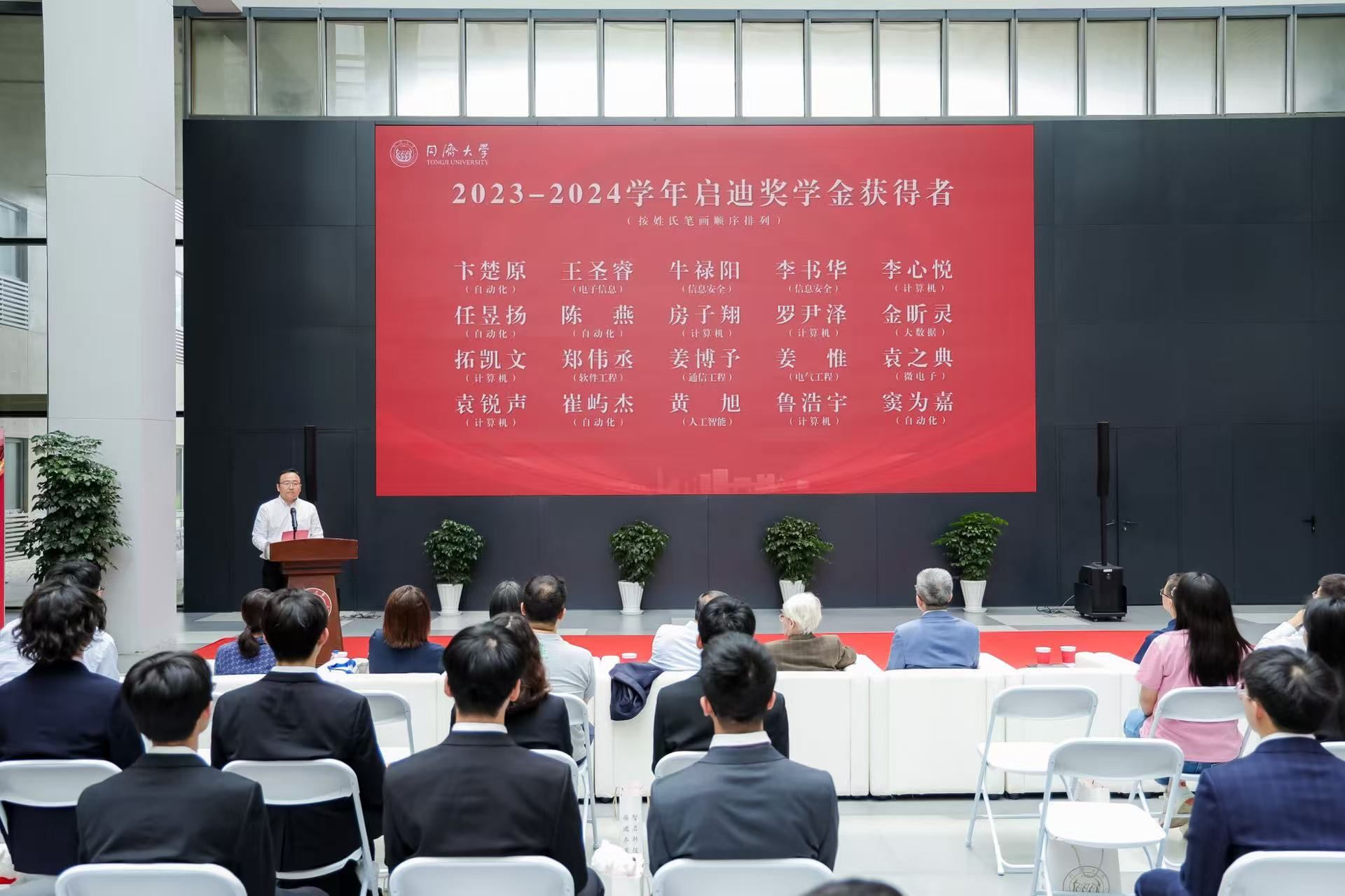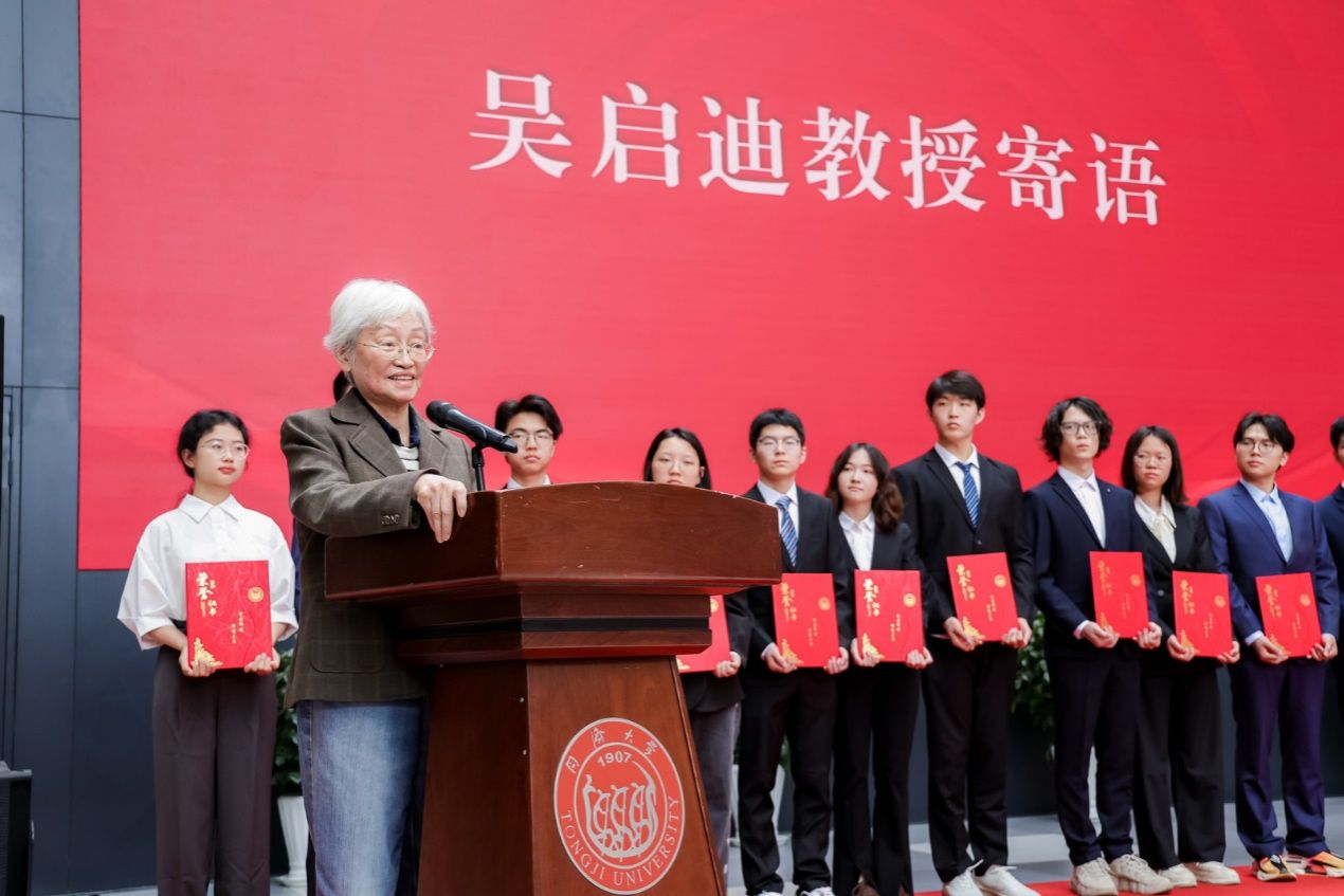 最后,吴启迪教授向全体获奖学子表示祝贺,同时也向所有为启迪奖学金贡献力量的捐赠人致以诚挚感谢。她指出,启迪奖学金的设立与发展,汇聚了众多心系人才培养的员工和教师的坚守与担当,也承载着对新时代同济学子在学术探索与工程实践中勇攀高峰的殷切期许。她着重强调了工程教育在人才培养中的战略地位和重要支撑,并勉励同学们积极参与高水平学科竞赛和科创项目,锻造系统思维、创新能力和工程素养。创新必须立足于实际工程应用,不能仅停留在理论层面,希望同学们在复杂工程问题的求解过程中锤炼跨学科知识整合能力,在真实工程场景的攻坚克难中培育严谨求实的工匠精神,真正成长为能解决“卡脖子”技术难题、具有国际竞争力的卓越工程师。