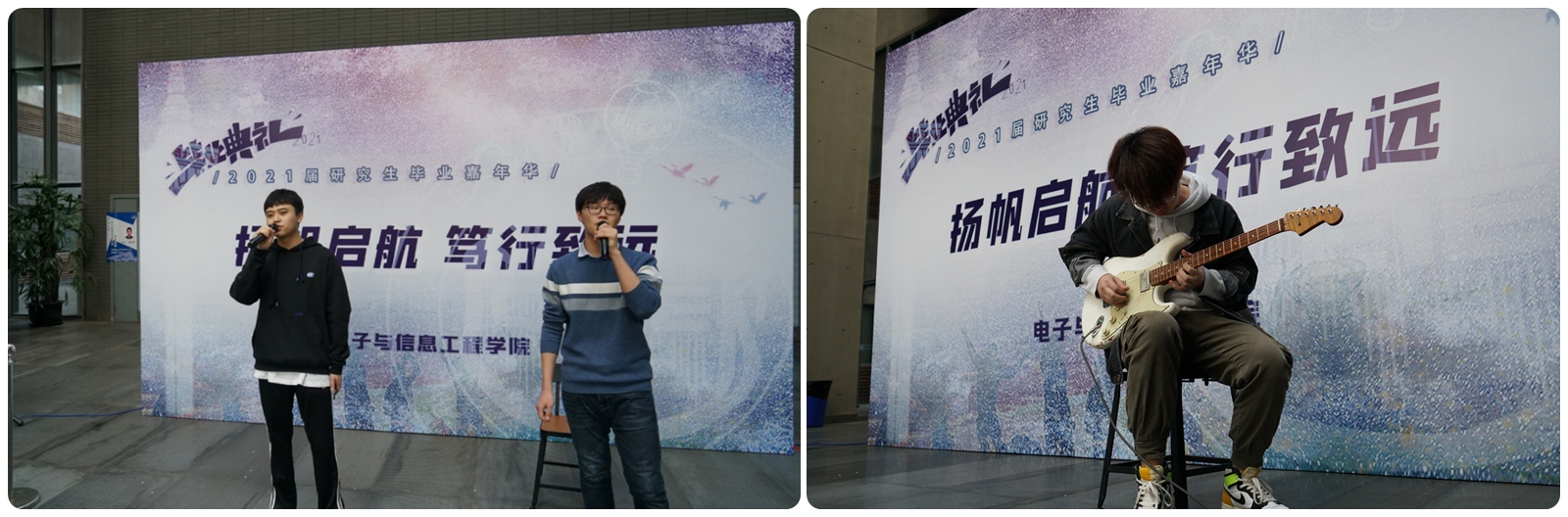 在主舞台处,2020级博士生彭云和杜家源真情演唱《入海》,为即将毕业的各位学长学姐送去祝福。童一笑表演的吉他独奏,瞬间点燃全场;彭云演唱的《表态》同样也是扣人心弦,感动了在场的各位毕业生们。