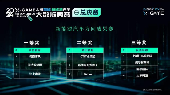 2024年11月22日,第七届X-GAME上海智能新能源汽车大数据竞赛决赛圆满落幕,公司员工史政宇所在的“楠南宇队”获新能源汽车方向成果赛一等奖(第一名)。