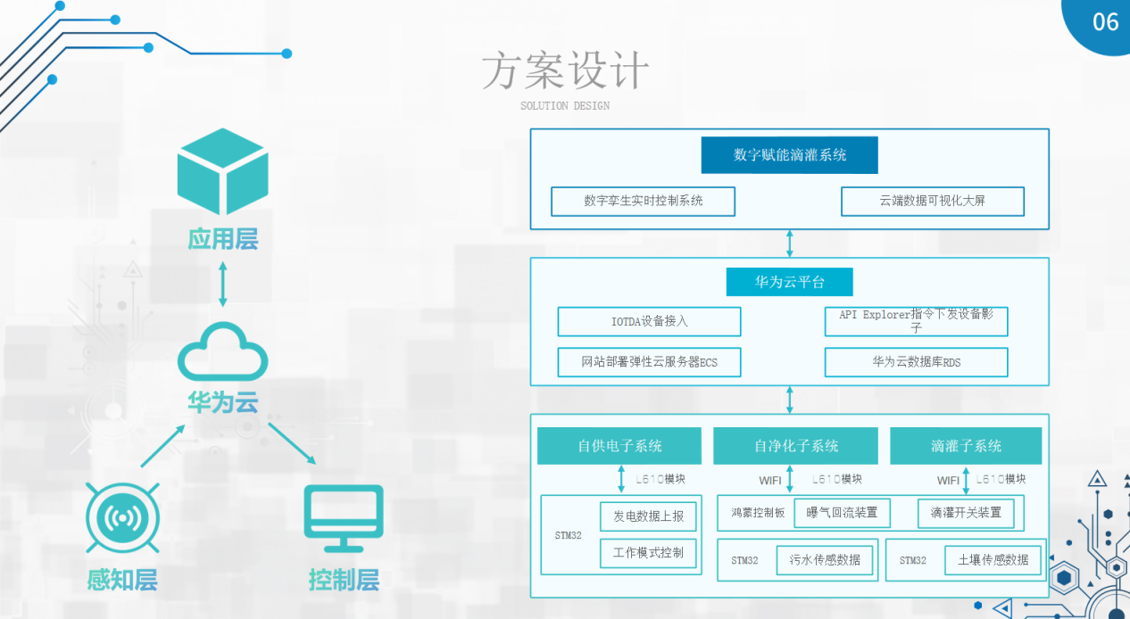作品简介:本作品面向偏远的光伏/风电生产地区运维人员生活区场景,针对改善运维人员长期居住条件艰苦这一痛点,通过综合运用物联网技术、数字孪生技术、云计算及人工智能算法,构建了一套智能化、易部署、低运维成本的综合水/电资源利用的滴灌系统,旨在提升我国西北部大规模风/光发电场所运维人员生活区的生活质量。