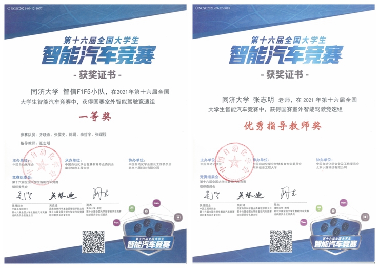 本次比赛是全国老员工智能车竞赛实验室组织参加的2021年的收官比赛,竞赛实验室负责人张志明老师和参与辅助管理的赵师兵、曾宪坤、韩子奇、冯翊、方少腾同学制定详细的参赛培训计划,选拔齐晓燕(自动化,大三)、李哲宇(自动化,大二)、张儒戈(自动化,大三)、陈晨(自动化,大三)、张曜程(人工智能,大三)五位同学组成“智信F1F5小队”参加室外智能驾驶竞速赛。受疫情防控影响,本次备赛准备时间短、难度大,队伍需要团结协作在室外场地冒着寒风、披星戴月调试车辆。备赛过程受到校本科生院、嘉定校区管委会和学院老员工创新基地等单位的大力支持,最终决赛成绩排名第十,获得全国一等奖1项。