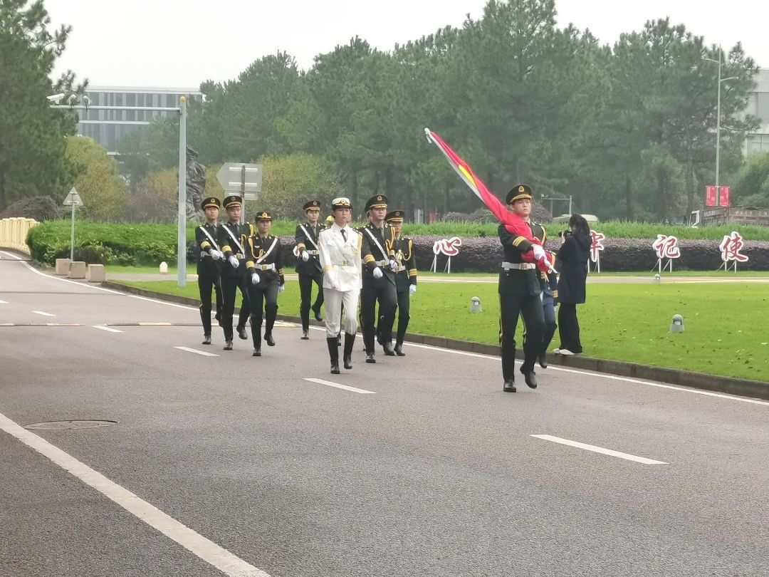 清晨七时,升旗仪式正式开始。国旗仪仗队的同学们迈着整齐划一、铿锵有力的步伐,以饱满的热情,护送着五星红旗正步走向旗杆。