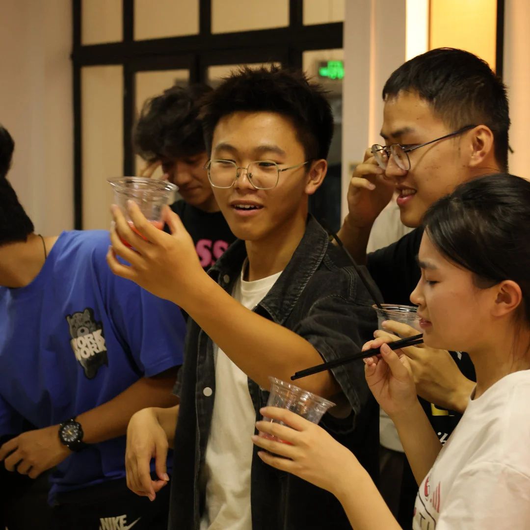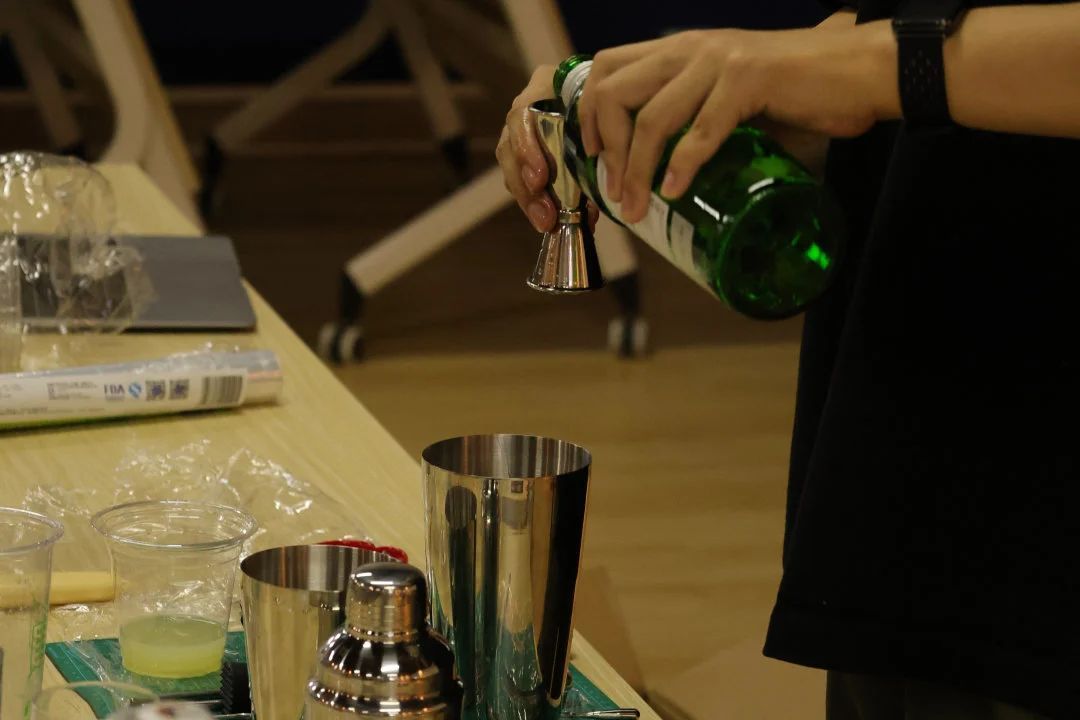 首先,本次活动的专业调酒师,同时也是21级电气工程及其自动化专业学长申昌永做了自我介绍,跟大家简单介绍了调酒文化的一些相关知识——调酒常用的器具,常用的饮品和其他材料(水果,薄荷等等)。之后申学长跟同学们了解了大家日常的一些饮酒习惯,借此向大家传达了要保持健康的饮酒习惯,做到小酌怡情,不能酗酒,也说明了本次活动也都是无酒精饮品的尝试。